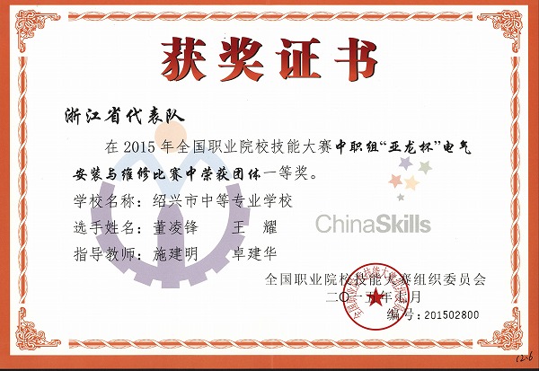 董凌峰、王耀同学荣获2015年全国职业院校技能大赛中职组电气安装与维修项目一等奖
