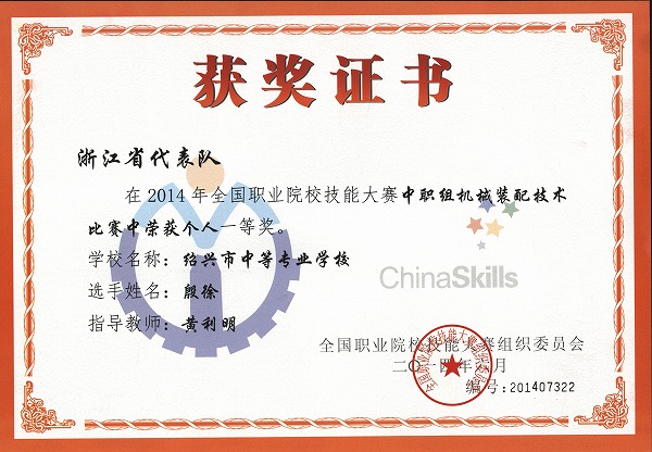 殷徐同学荣获2014年全国职业院校技能大赛中职组机械装配技术比赛项目一等奖