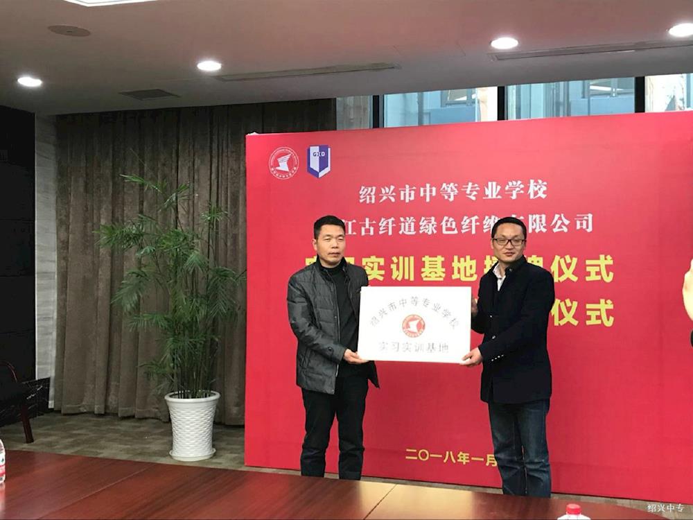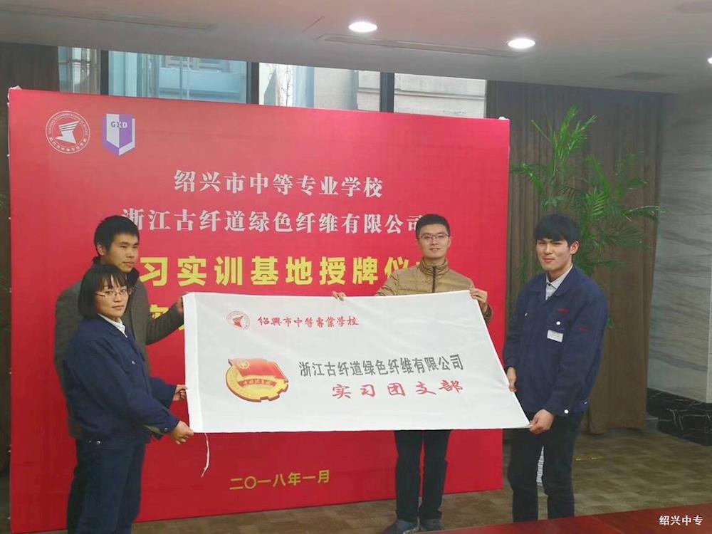 2018 年 1 月 11 日,开云官方注册在浙江古纤道绿色纤维有限公司举行实习实训基地授牌仪式与暨实习团支部授旗仪式。绍兴中专李金光校长、学生处副处长李鹏、团委书记虞峰、机电系书记吴志燕携手古纤道企业领导温国奇、姜传忠、陈铖与杨最梅参加了此次仪式。