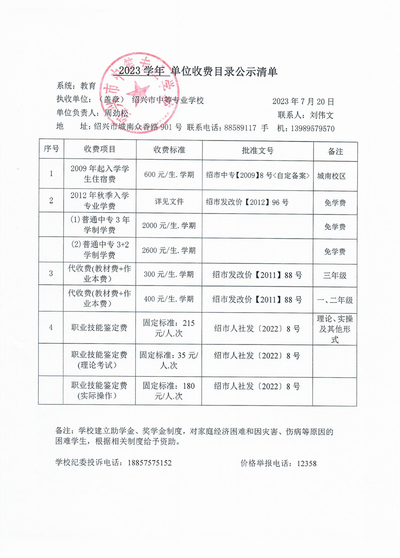 2023学年收费目录公示清单