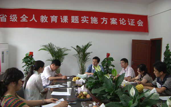 09年省级全人教育课题方案论证会 来源:教科室 作者: 发布时间:2015-11-25 浏览次数: 次 【字体:小 大】 6月10日,由教科室牵头,邀请了市教育教学研究院副院长王黎明老师来校就我校省级全人教育课题进行研究方案的论证,校领导、办公室、教务处、学生处等参与课题的部门负责人参加了会议。王副院长从课题立意、研究目标、研究内容、研究方法等全方位给予了指导点评,课题参与者各自发表了自己的观点认识。通过这次活动,更加明确了本课题的指导思想与研究方向,课题组成员统一了思想,对进一步实施全人教育改革充满了信心。