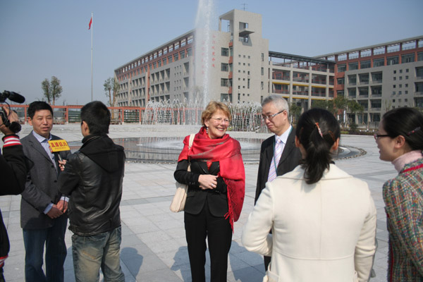绍兴市教育局陈纪钢副局长和谢菲尔德学院院长麦克 唐娜 女士、国际发展部主 任许仲文 先生在我校校领导陪同下首先参观了我校位于城南的新校,一流的教育设施、暂新的校园环境令英国嘉宾大为赞赏;多样化的专业设置,严格的教学管理模式又激发了英国代表参观了解的浓厚兴趣。