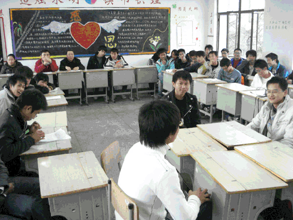 2008年12月9日,07机电(2)班全体同学欢聚一堂,在1304教室成功举行了“感恩的心”主题班会。主持人徐豪峰一段温馨的开场白勾起了同学们对往事的回忆,同学们在主题班会上个个畅所欲言,回忆起在自己的学习、成长过程中帮助过自己的人,并表达了对父母、师长、同学、朋友的感激之情。节目形式丰富多彩,有小品、诗朗诵,还有讲故事、知识问答、歌曲等等。