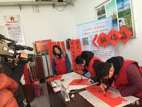旅客朋友:请带上一份绍兴中专师生写的春联和“福”字,带着书法之乡人朴素的祝福回家吧!